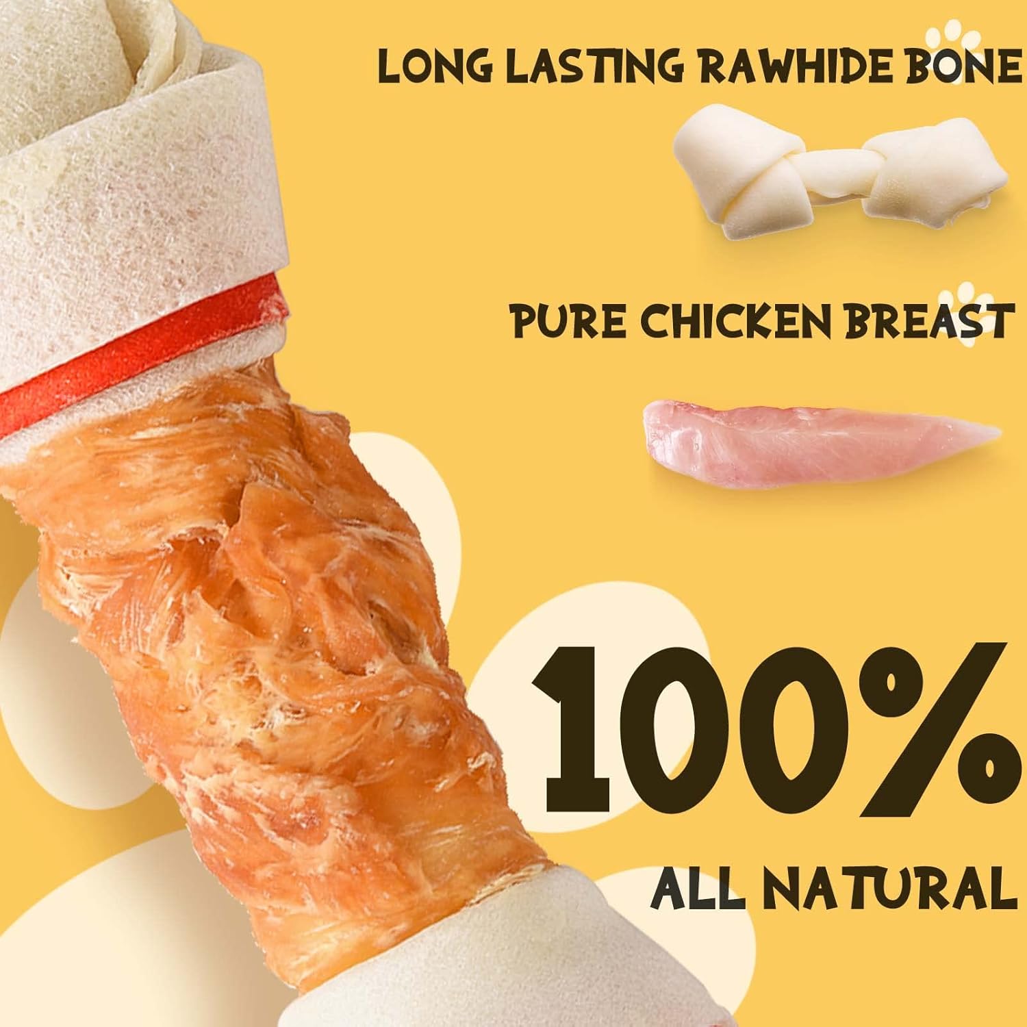 DOG CHEWS LONG LASTING: Chicken Wrap Rawhide sticks provide fun chewing enjoyments for your dogs, to naturally reduce plaque and tarter build up.Say goodbye to destructive chewing! The tasty dog treat strengthens gums and improves overall dog dental health. This chewy dog bones will keep your furniture and shoes safe while satisfying your pup's urge to chew