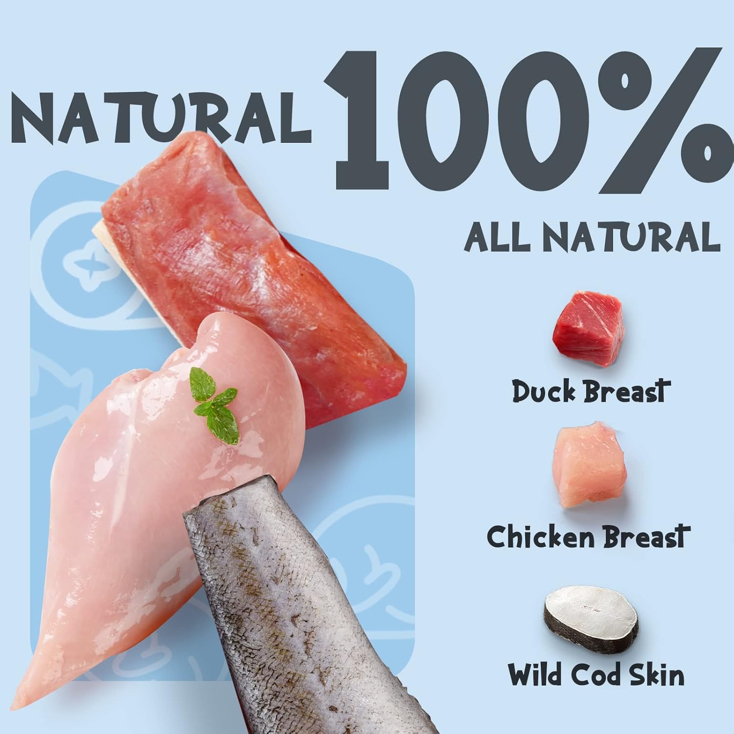 - 100% Natural Ingredient: Made of premium quality pure natural chicken and duck as the very first ingredient, it?s wrapped cod skin inside which is totally grain-free with no artificial colors and additives that strictly pass the US food safety standards