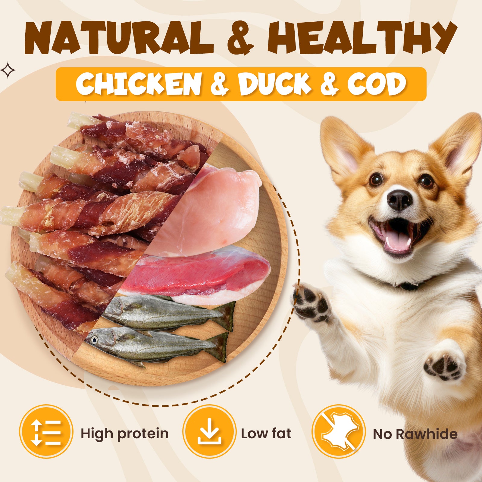 ASMPET Rawhide Free Dog Treats Chicken Jerky & Duck Wrap Cod Sticks, Healthy Treats for Dogs, Soft Chewy Healthy Natural Treats, 15pcs, 11oz