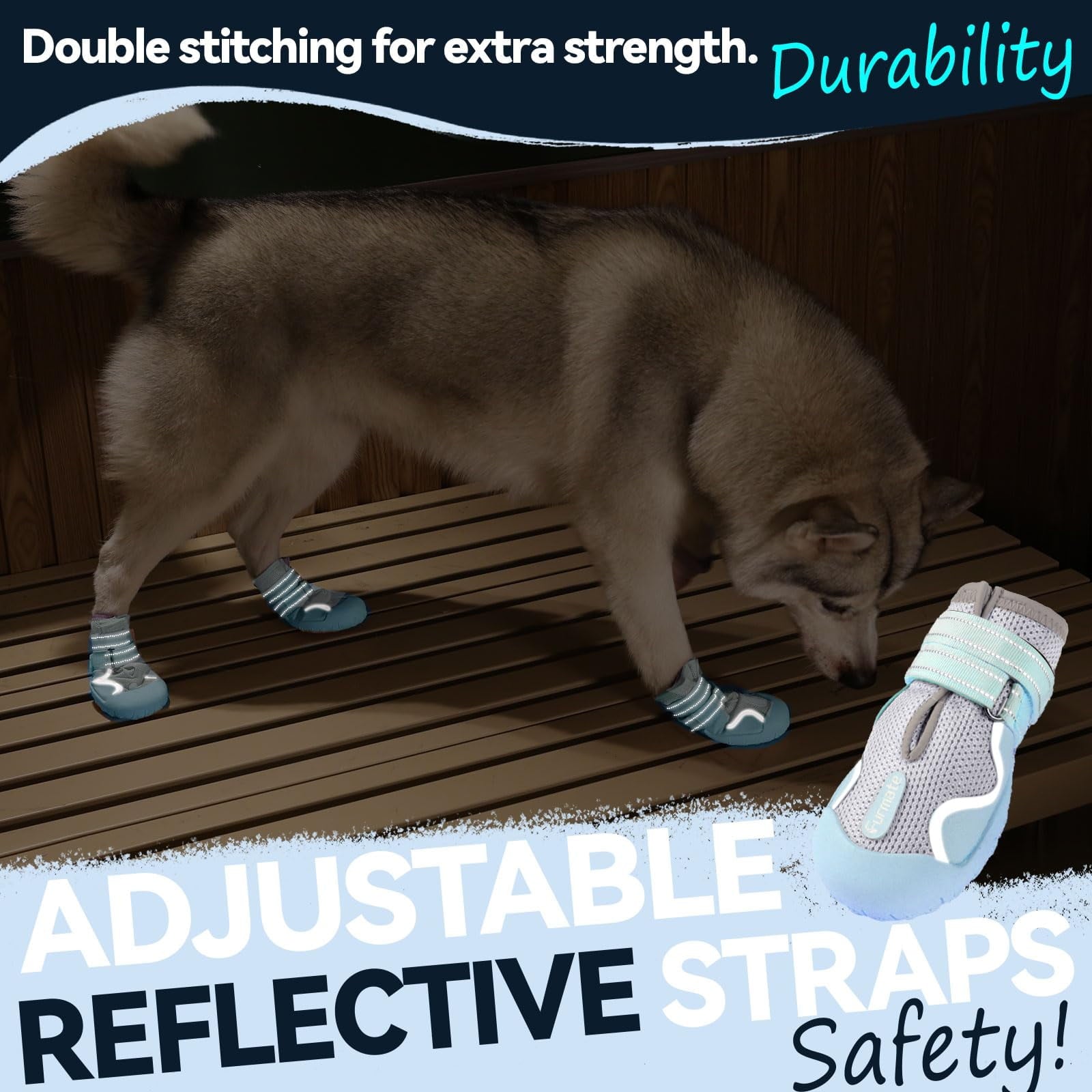 COMFORTABLE & BREATHABLE: High-density mesh keeps paws fresh and dry, suitable for all seasons;The dog boots conform to the shape of your dog's paws, soft and lightweight; Protects your dog's paws from summer hot pavement, snow, salt, mud and sharp objectsADJUSTABLE REFLECTIVE STRAPS: Dual velcro straps ensure a secure and snug fit while preventing slipping; The wide opening allows easy on/off access, with reflective straps enhancing visibility for safer nighttime walksWATERPROOF & ANTI-COLLISION: The waterproof design keeps paws dry in rain, mud; These boots protect your dog's paws while ensuring comfort ; The reinforced toe cap against impacts during exercise, providing dual protection for paw safetyANTI-SLIP RUBBER SOLES FOR STABILITY: Soft rubber soles provide excellent grip, helping dogs walk securely on slippery hardwood floors, rugged trails, ice; Perfect for any adventure, these boots reduce walking pressure, ensuring stability and safetyPAW PROTECTION FOR YOUR DOG: Prevents your dog¡¯s scratches from damaging furniture, hardwood floors, vehicles; Prevent licking of wounded paws, maintains cleanliness without compromising paw mobility during active play