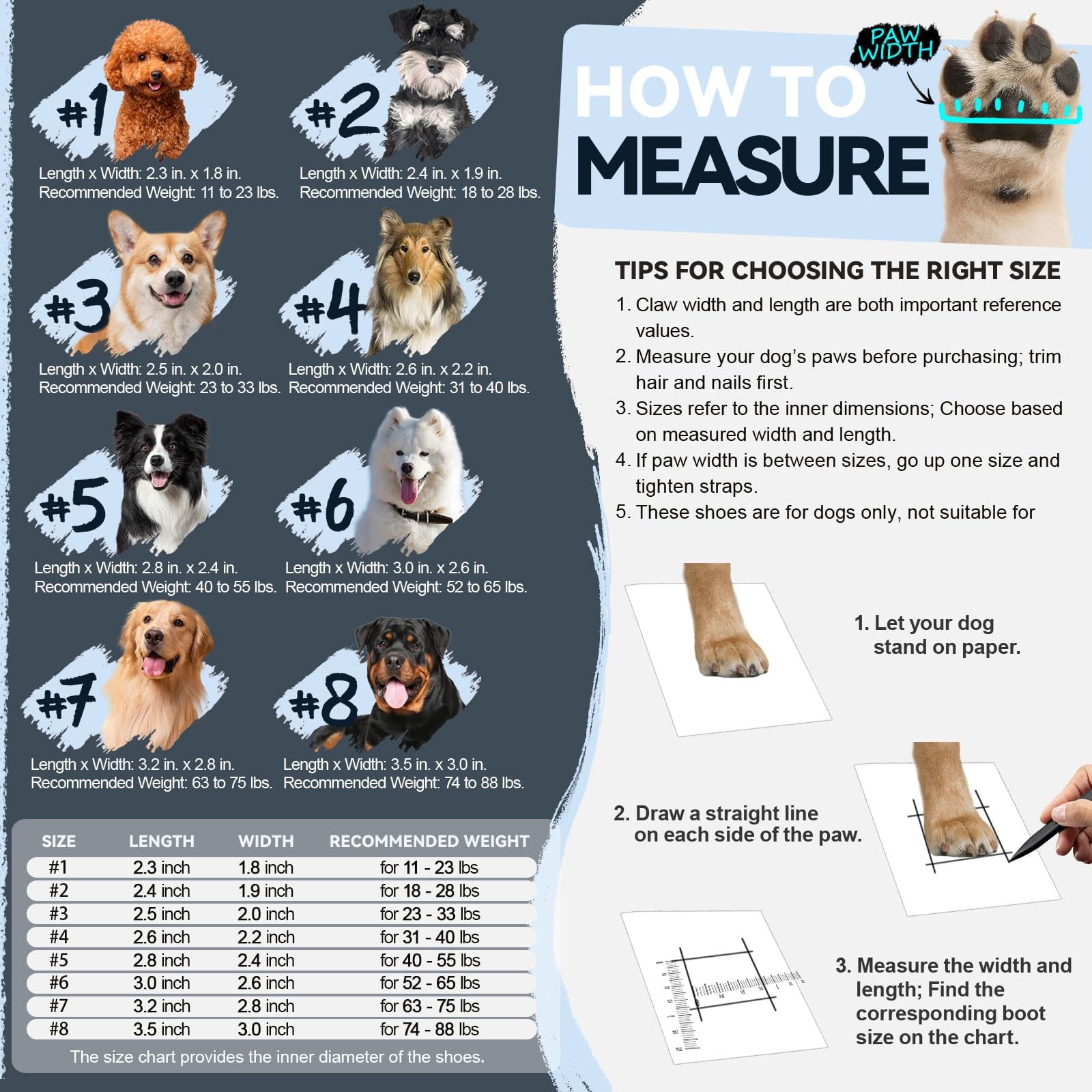 COMFORTABLE & BREATHABLE: High-density mesh keeps paws fresh and dry, suitable for all seasons;The dog boots conform to the shape of your dog's paws, soft and lightweight; Protects your dog's paws from summer hot pavement, snow, salt, mud and sharp objectsADJUSTABLE REFLECTIVE STRAPS: Dual velcro straps ensure a secure and snug fit while preventing slipping; The wide opening allows easy on/off access, with reflective straps enhancing visibility for safer nighttime walksWATERPROOF & ANTI-COLLISION: The waterproof design keeps paws dry in rain, mud; These boots protect your dog's paws while ensuring comfort ; The reinforced toe cap against impacts during exercise, providing dual protection for paw safetyANTI-SLIP RUBBER SOLES FOR STABILITY: Soft rubber soles provide excellent grip, helping dogs walk securely on slippery hardwood floors, rugged trails, ice; Perfect for any adventure, these boots reduce walking pressure, ensuring stability and safetyPAW PROTECTION FOR YOUR DOG: Prevents your dog¡¯s scratches from damaging furniture, hardwood floors, vehicles; Prevent licking of wounded paws, maintains cleanliness without compromising paw mobility during active play