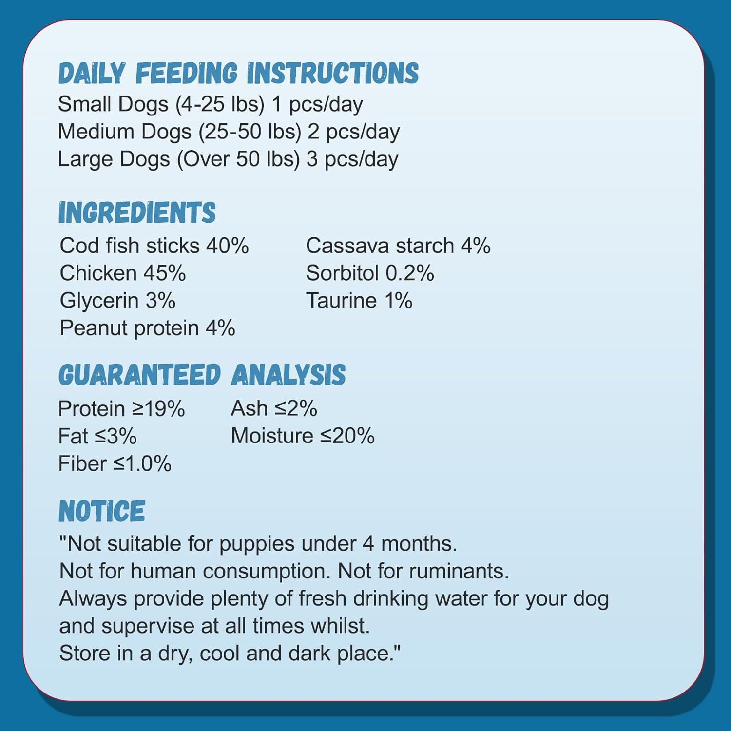 - 1% Taurine: Enriched with taurine, cod dog treats support your dog's heart and eye health, making these snacks not only delicious but also beneficial for your pet's well-being